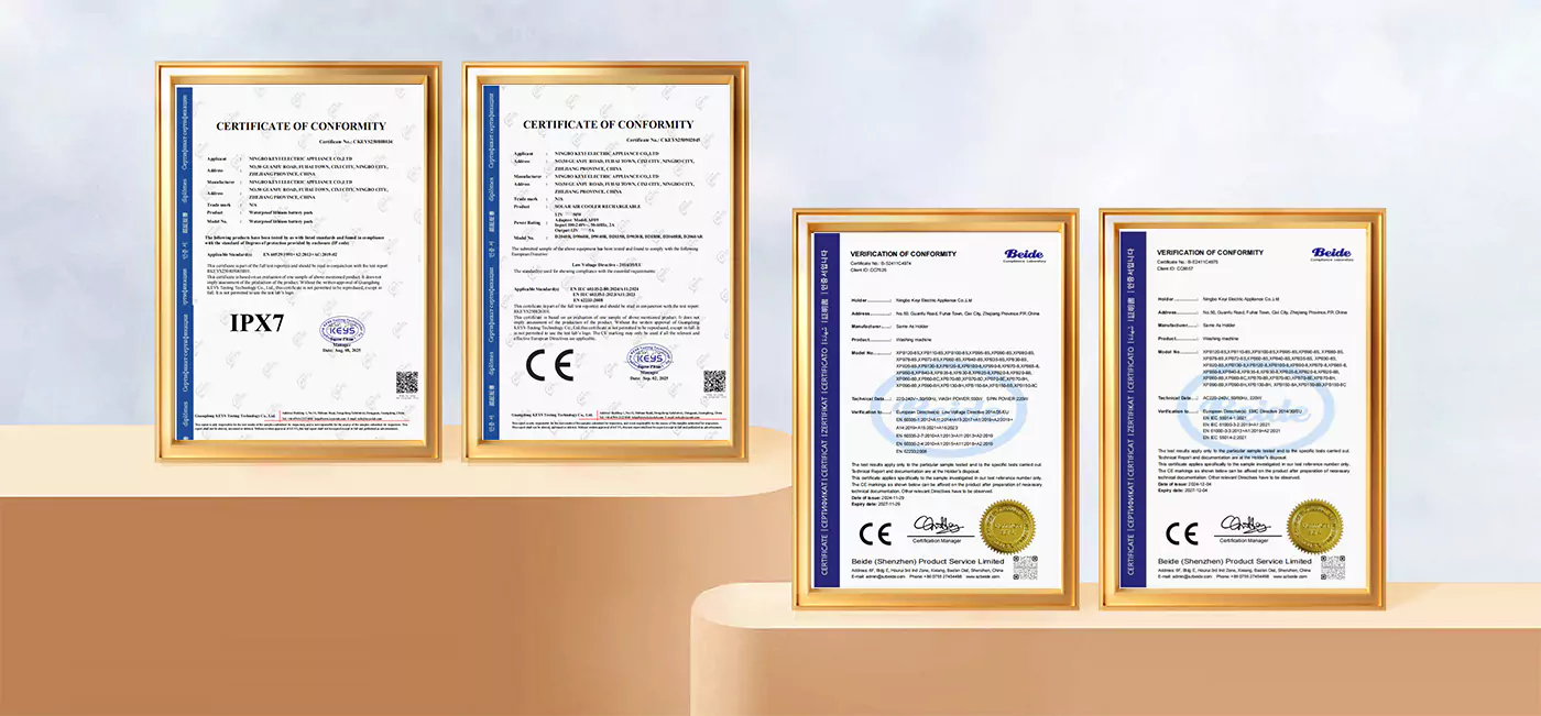 Mesin cuci dan pendingin udara kami telah lulus standar pengujian UE dan memperoleh sertifikasi CE. Baterainya memiliki peringkat tahan air IPX7. Kami juga disertifikasi sebagai penjual luar biasa di platform e-commerce domestik dan Alibaba.